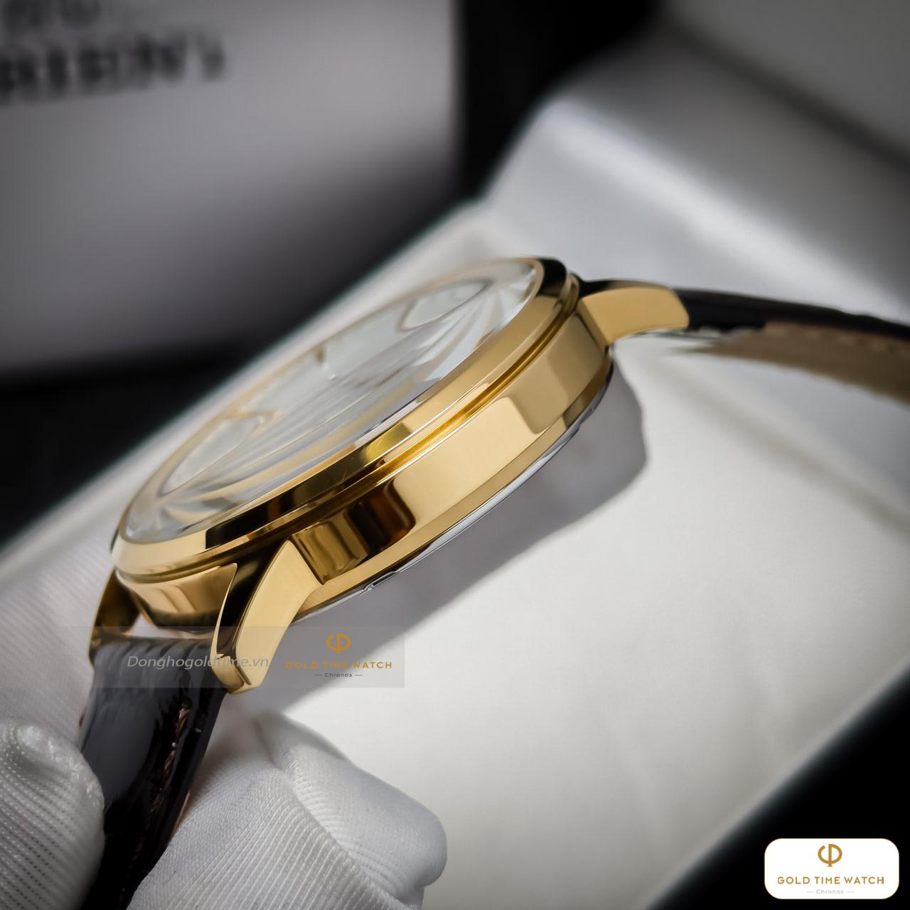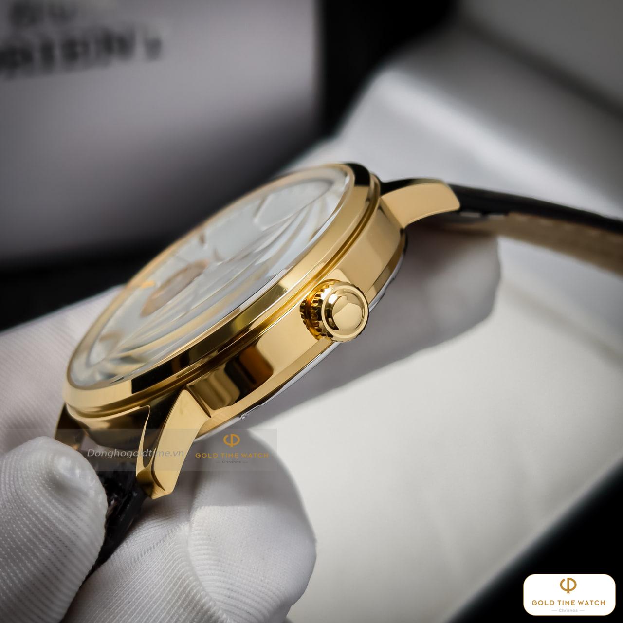 Vỏ mạ vàng sang trọng: Lớp vỏ được hoàn thiện với tông màu vàng rạng rỡ, kết hợp cùng mặt số trắng trang nhã, tạo nên một tổng thể vô cùng quý phái.
