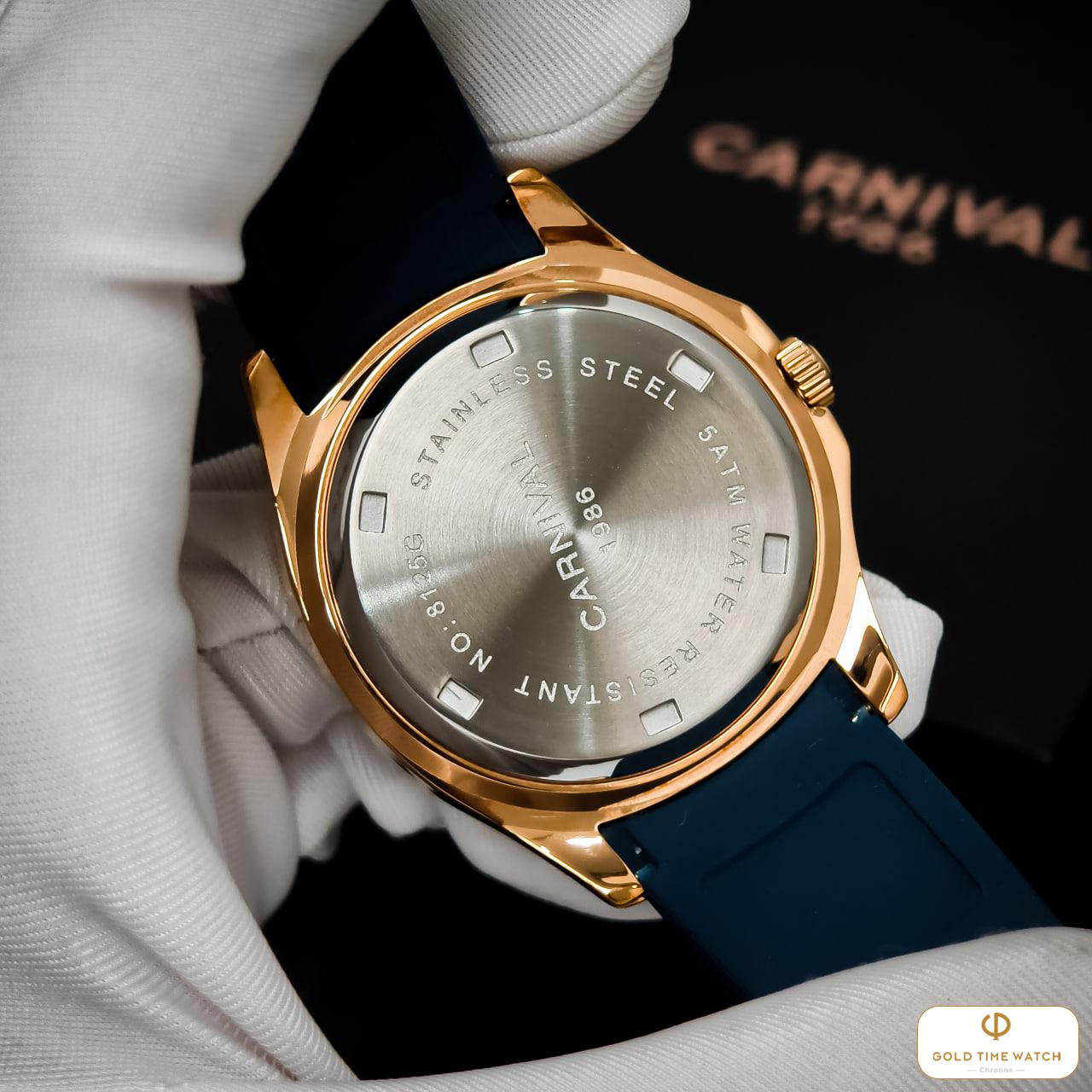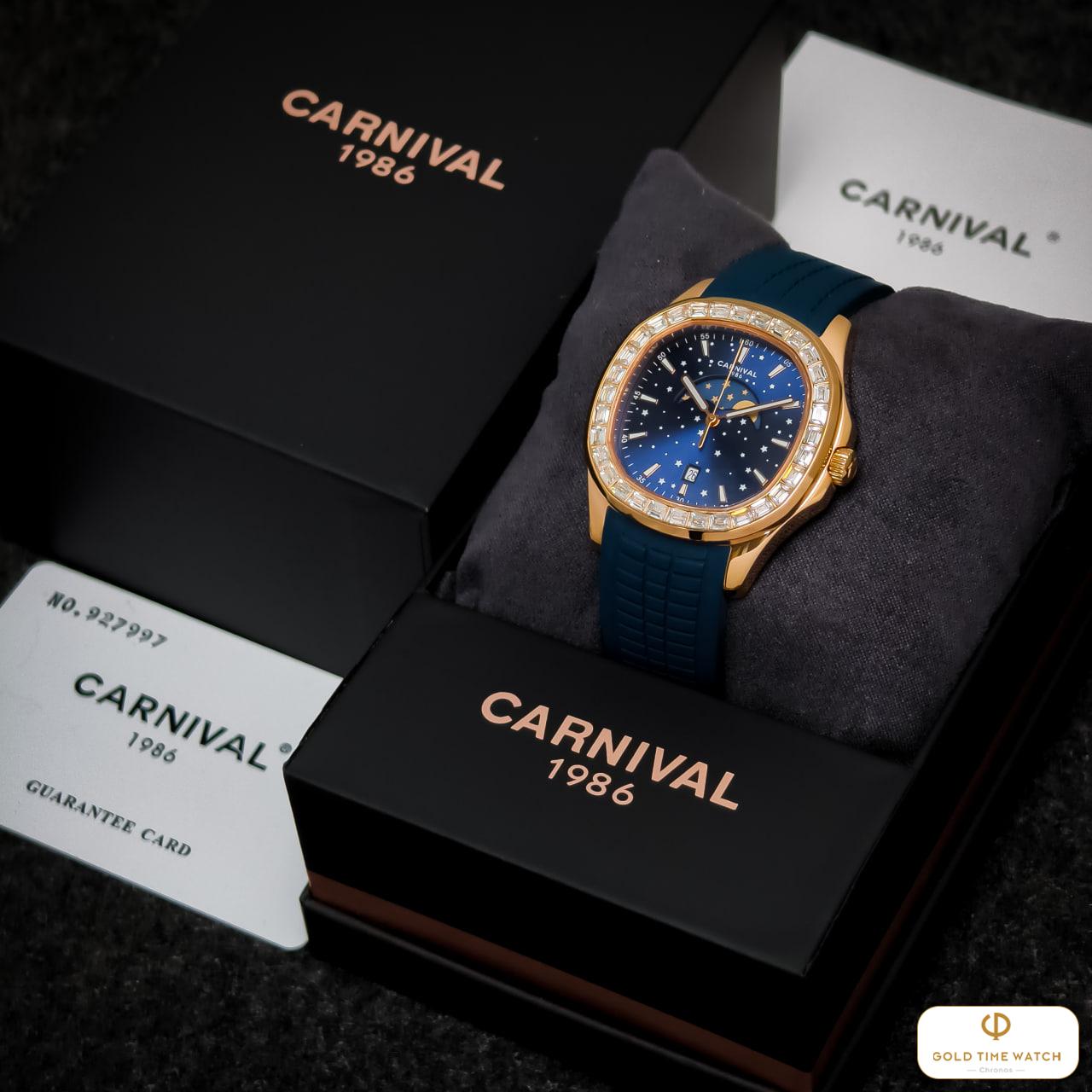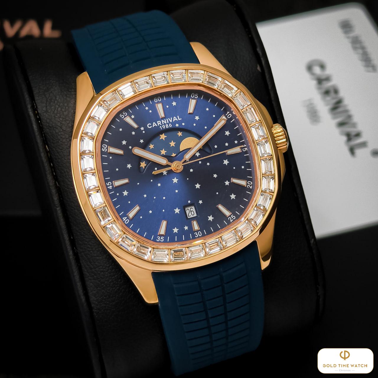 Mẫu Carnival 8125G-VH-DCS-X là sự kết hợp hoàn hảo giữa nét đẹp lãng mạn của bầu trời đêm và phong cách thể thao sang trọng. Với thiết kế vành đính đá rực rỡ cùng tính năng Moonphase độc đáo, chiếc đồng hồ này là món phụ kiện đẳng cấp dành cho những quý ông yêu thích sự khác biệt.