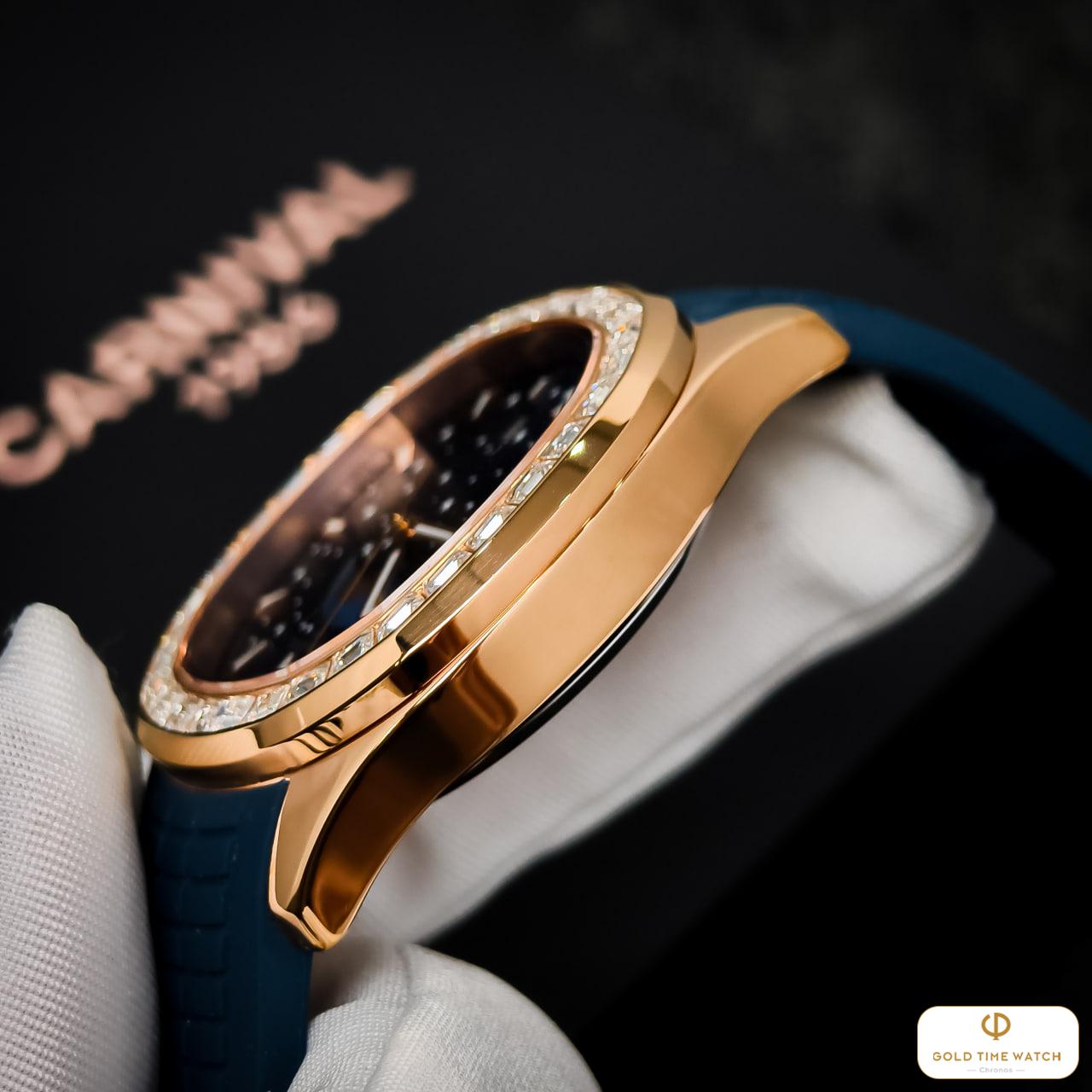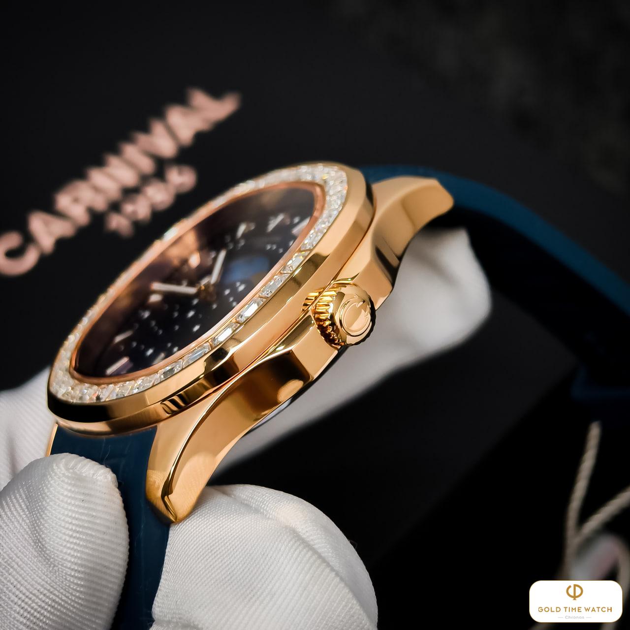 Vành đính đá sang trọng: Vỏ bát giác bo tròn được đính đá sáng bóng, kết hợp cùng tông màu vàng hồng quý phái, tạo nên diện mạo xa xỉ và nổi bật.