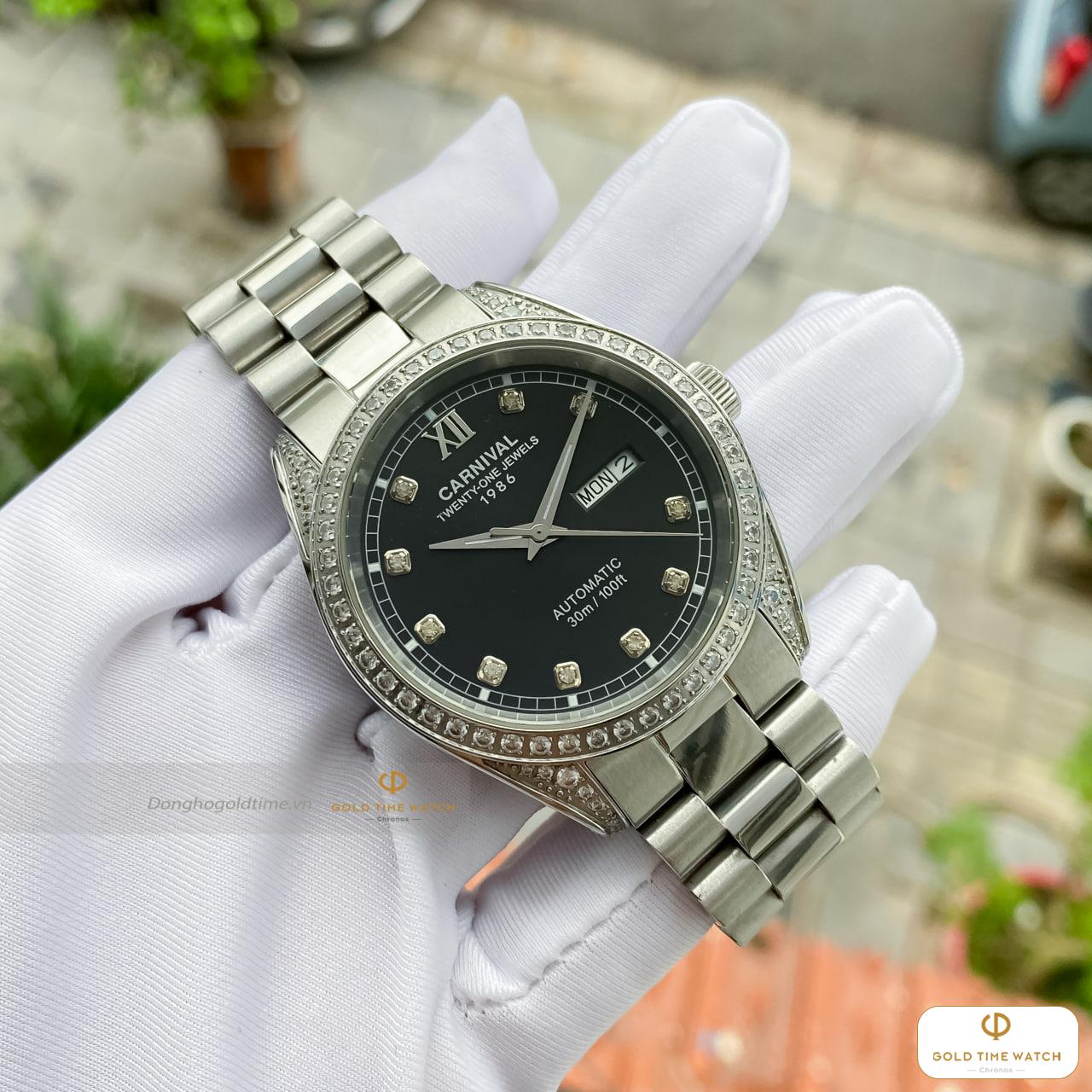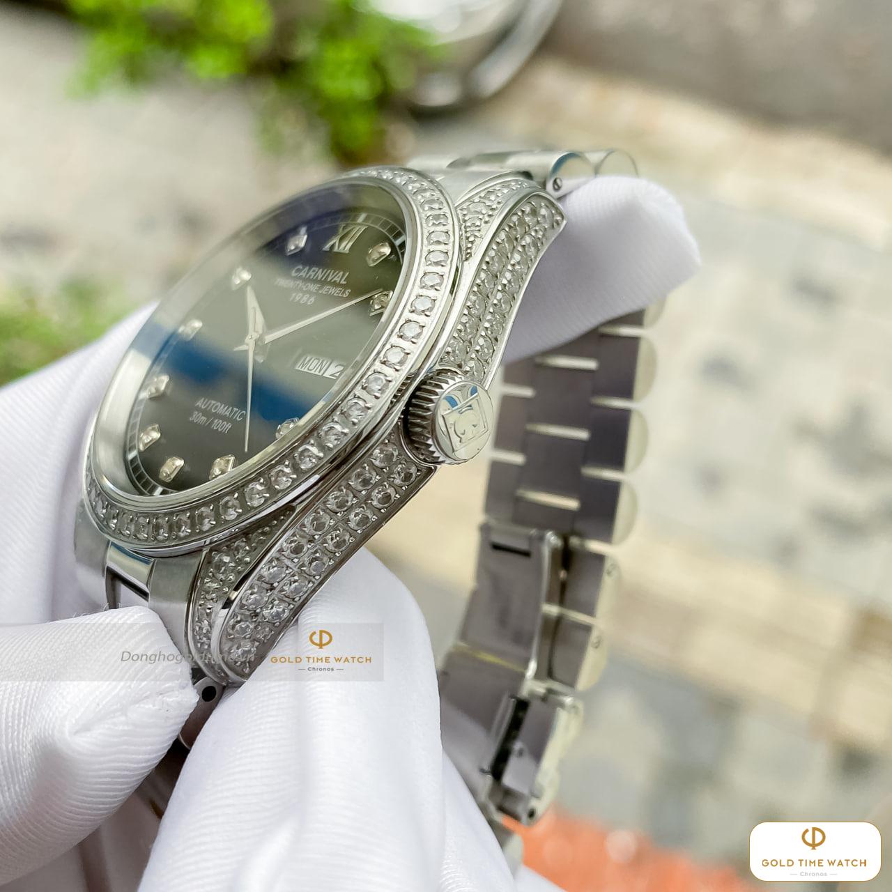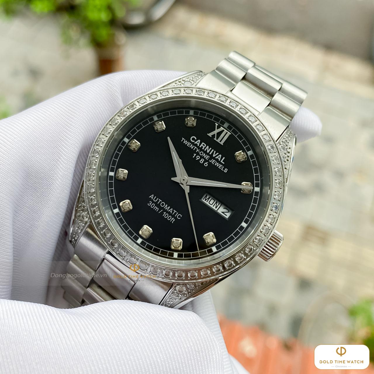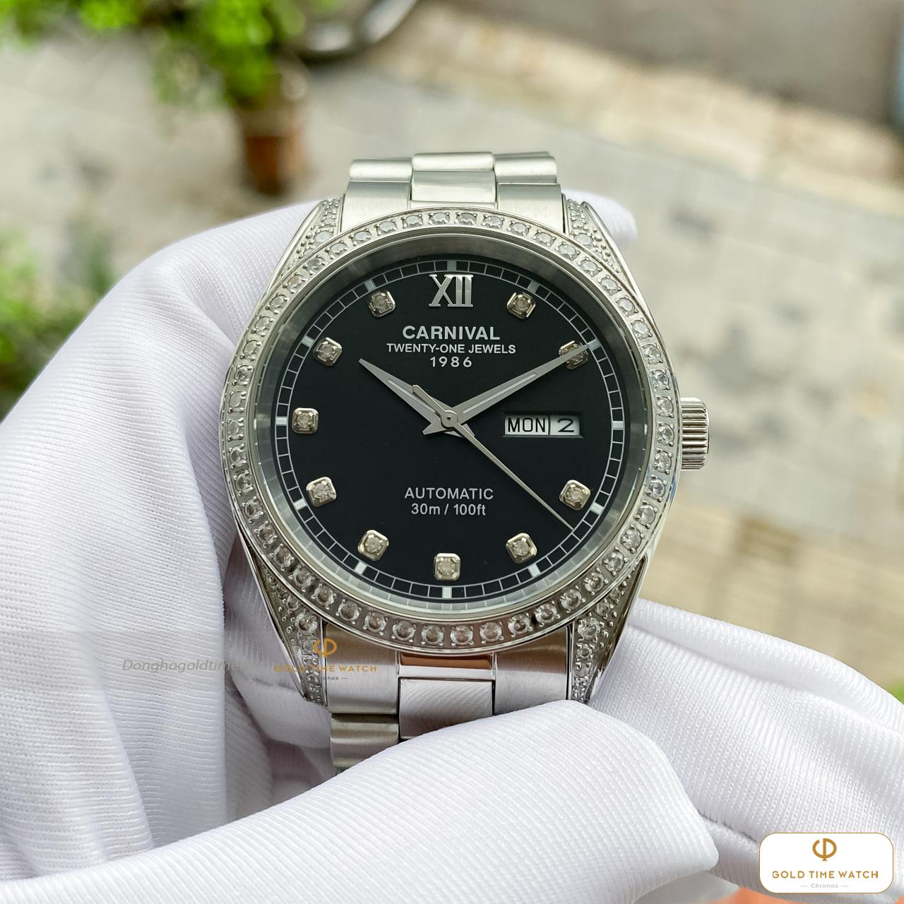 Chiếc đồng hồ Carnival Automatic 1986 là sự kết hợp hoàn hảo giữa kỹ thuật chế tác cơ khí chính xác và phong cách thời trang thượng lưu. Với mặt số đen huyền bí làm nền, các cọc số được thay thế bằng những viên đá lấp lánh, tạo nên vẻ ngoài xa hoa ngay từ cái nhìn đầu tiên.