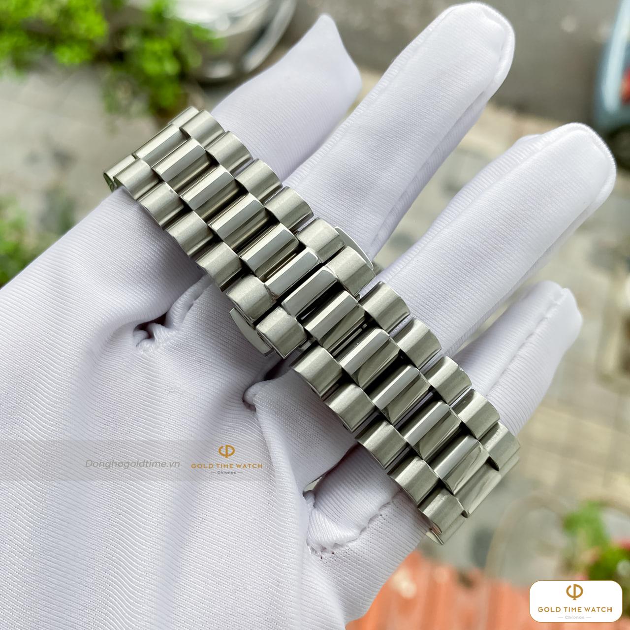 • Thiết kế ấn tượng: Điểm nhấn rực rỡ nhất chính là vòng bezel và phần vấu (lugs) được đính đá tinh xảo, bắt sáng cực tốt dưới mọi góc nhìn. Kim đồng hồ dạng kiếm thanh mảnh cùng lịch thứ/ngày tại góc 3h tạo nên sự tiện dụng và cân đối.
